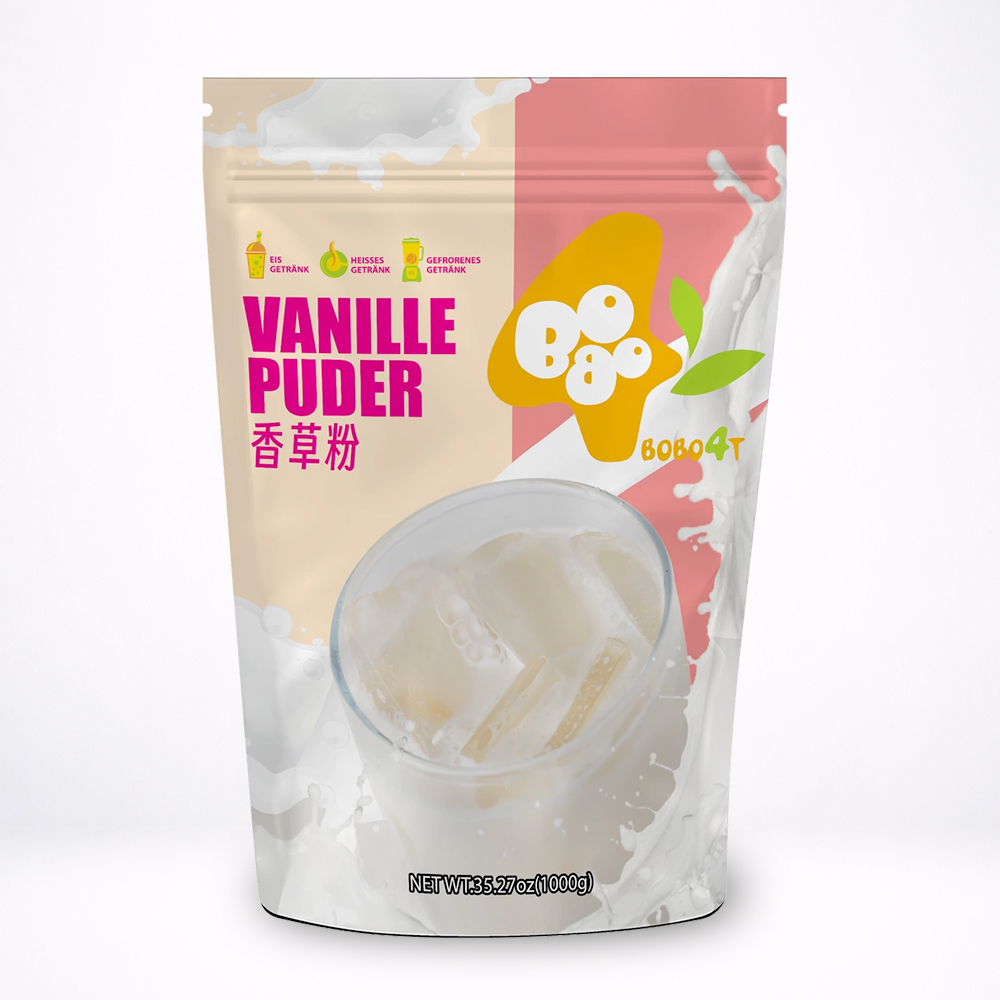 Pó instantâneo sabor Baunilha — PT Ingredientes: Açúcar, creme vegetal (óleo de coco totalmente hidrogenado, xarope de glicose, amido modificado, antiaglomerante: fosfato de cálcio (E341)), pó de óleo vegetal (palma), amido de tapioca, aroma de baunilha, antiaglomerante: dióxido de silício (E551). Informação nutricional (100 g): Energia 2177 kJ / 520 kcal; Lípidos 26 g (sat. 20 g); Hidratos de carbono 72 g (açúcares 61 g); Proteínas 0 g; Sal <0,5 g. Peso líquido: 1 kg. Origem: Taiwan. Conservação: Conservar em local fresco e seco, ao abrigo da luz. Importado por: Bubble Supply Lda, Rua Pimenta nº3, 1990-254 Lisboa, NIF 515895628