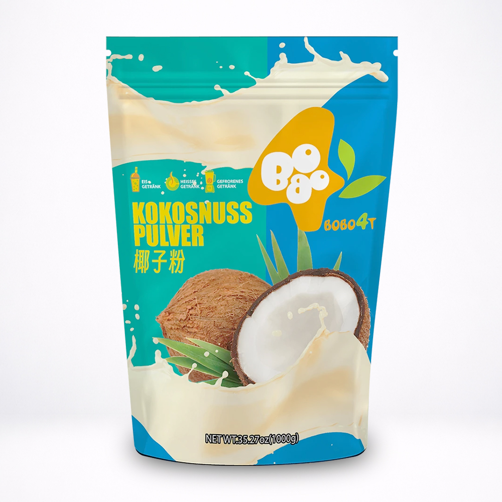 Coconut em pó — PT Ingredientes: Açúcar, creme vegetal (óleo de coco totalmente hidrogenado, xarope de tapioca, amido modificado, antiaglomerante: fosfato de cálcio (E341)), pó de coco (xarope de glucose, pó de coco), emulsionante: lecitina de soja (E322), polifosfato de sódio (E452i), mono e diglicéridos de ácidos gordos (E471), regulador de acidez: fosfato dipotássico (E340ii), antiaglomerante: dióxido de silício (E551), óleo de palma em pó, maltodextrina, aroma de coco. Informação nutricional (100 g): Energia 2127 kJ / 508 kcal; Lípidos 23 g (sat. 17 g); Hidratos de carbono 66 g (açúcares 35 g); Proteínas 0 g; Sal <0,5 g. Peso líquido: 1 kg. Origem: Taiwan. Conservação: Conservar em local fresco e seco, ao abrigo da luz. Importado por: Bubble Supply Lda, Rua Pimenta nº3, 1990-254 Lisboa, NIF 515895628