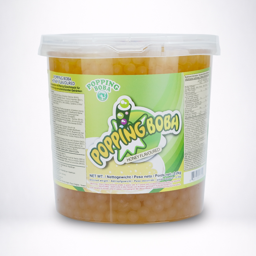 POP BALL sabor MelPT Ingredientes: Água, xarope de frutose-glicose, solução de D-sorbitol (E420), lactato de cálcio (E327), amido modificado, alginato de sódio (E401), aroma de mel, espessante: goma xantana (E415), espessante: goma de alfarroba, carboximetilcelulose (E466), corante: caramelo (E150a), conservante: sorbato de potássio (E202). Informação nutricional (100 g): Energia 460 kJ / 110 kcal; Lípidos 0 g (sat. 0 g); Hidratos de carbono 26 g (açúcares 24,7 g); Proteínas 0 g; Sal 0,04 g. Peso líquido: 3,2 kg — Escorrido: 2,3 kg. Origem: Taiwan. Conservação: Conservar em local fresco e seco. Após abertura, refrigerar. Importado por: Bubble Supply Lda, Rua Pimenta nº3, 1990-254 Lisboa, NIF 515895628