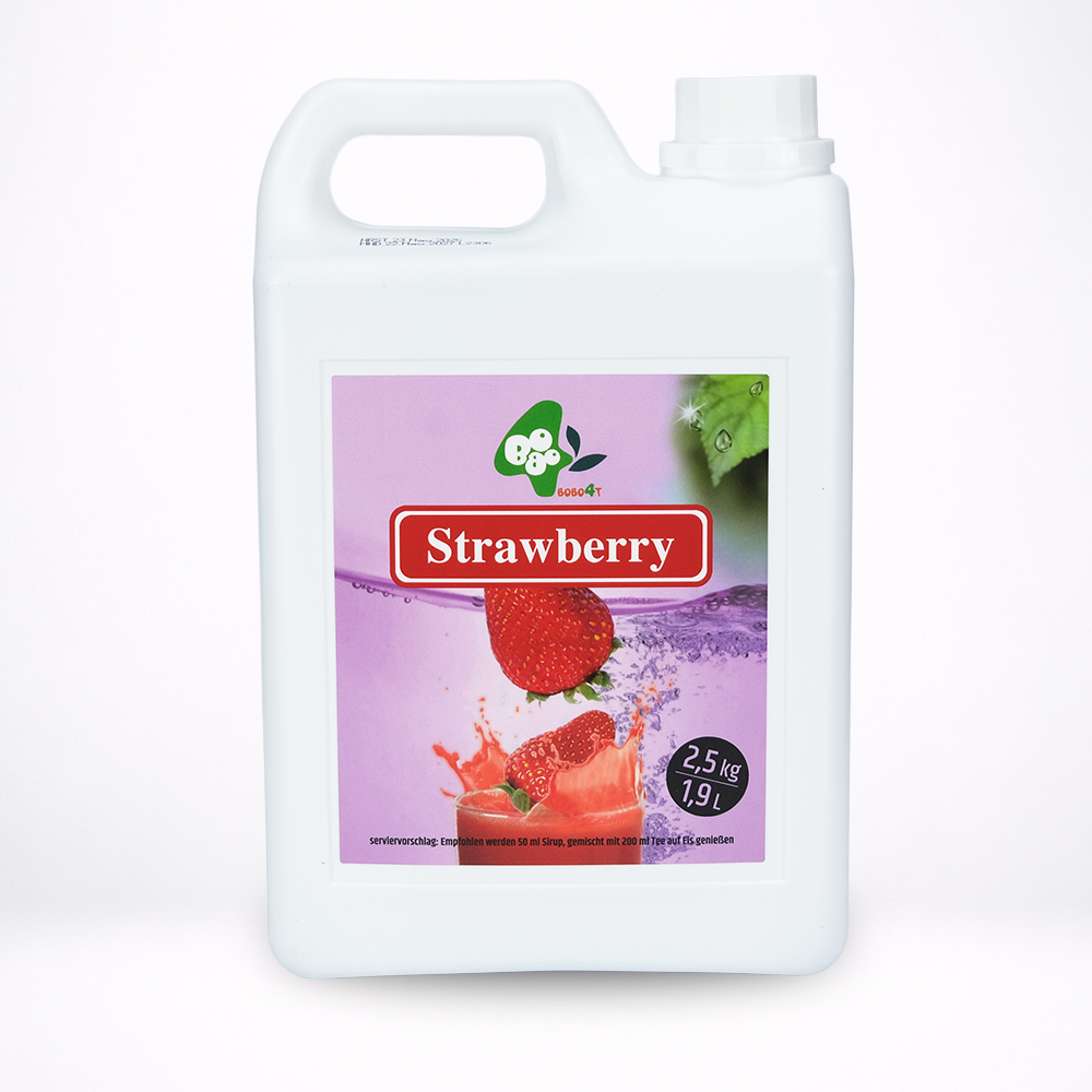Xarope de Morango — PT Ingredientes: Xarope de frutose e glicose, polpa de morango (10%), açúcar, água, acidificante: E330, E296, agentes de turvação (água, óleo de palma, E1450, E420, E1520, E330), conservante: E202, aroma, citrato de sódio (E331), edulcorante: sucralose, corante: E129. Informação nutricional (100 g): Energia 1109 kJ / 265 kcal; Lípidos 0 g (sat. 0 g); Hidratos de carbono 61 g (açúcares 57 g); Proteínas 0 g; Sal 0 g. Peso líquido: 2,5 kg. Conservação: Conservar à temperatura ambiente, em local seco e sem odores. Após abertura, refrigerar. Advertência: Contém corante E129, que pode afetar a atividade e a atenção das crianças. Importado por: Bubble Supply Lda, Rua Pimenta nº3, 1990-254 Lisboa, NIF 515895628