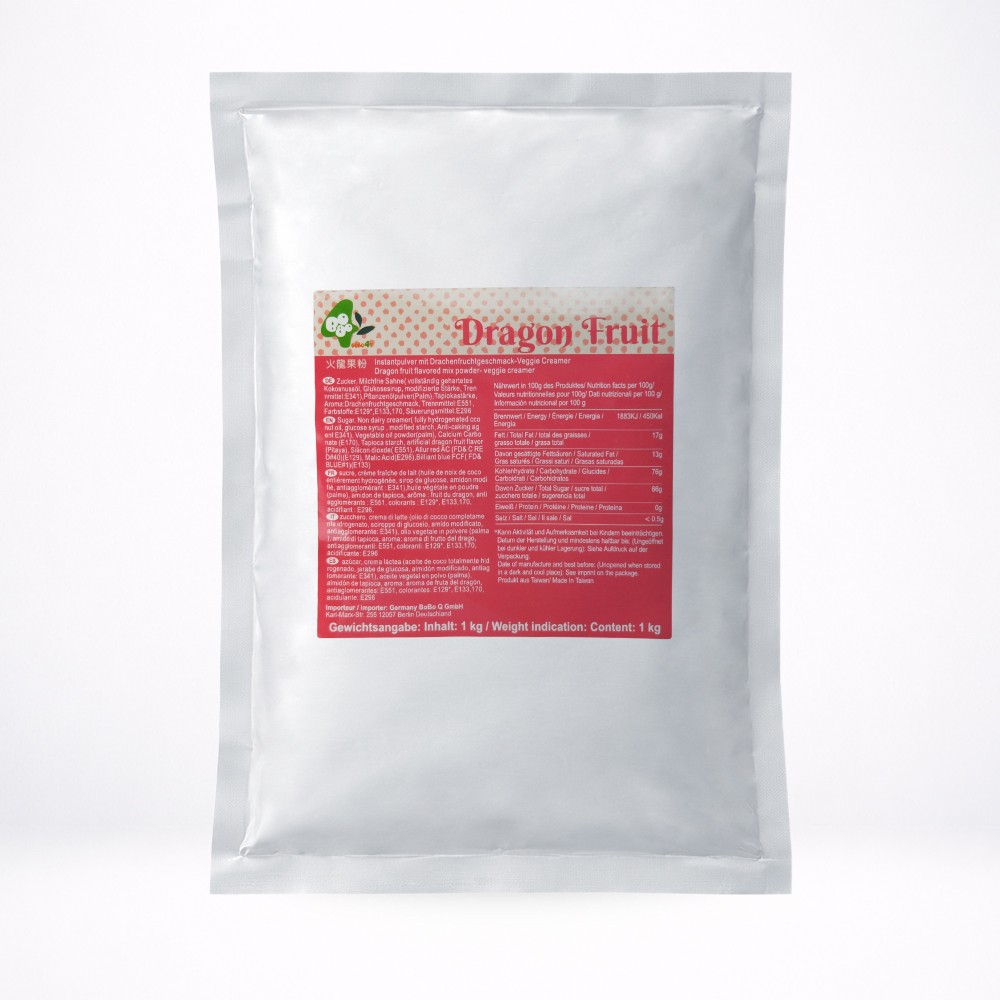 Pó instantâneo sabor Fruta do Dragão — PT Ingredientes: Açúcar, creme não lácteo (óleo de coco totalmente hidrogenado, xarope de glucose, amido modificado, antiaglomerante: E551), óleo vegetal em pó (palma), amido de tapioca, aroma de fruta do dragão, antiaglomerante: E551, corantes: E129*, E133, E170, acidificante: E296. Informação nutricional (100 g): Energia 1883 kJ / 450 kcal; Lípidos 17 g (sat. 13 g); Hidratos de carbono 76 g (açúcares 66 g); Proteínas 0 g; Sal <0,5 g. Peso líquido: 1 kg. Origem: Taiwan. Conservação: Conservar em local fresco e seco. Advertência: Pode conter vestígios de leite. Importado por: Bubble Supply Lda, Rua Pimenta nº3, 1990-254 Lisboa, NIF 515895628