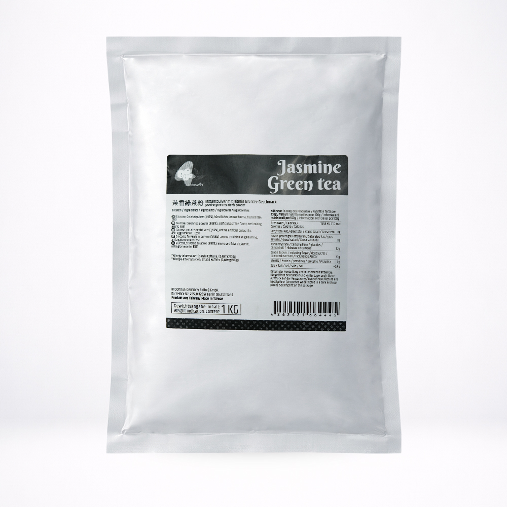 Pó instantâneo sabor Chá Verde de Jasmim — PT Ingredientes: Glucose, pó de chá verde (3,96%), aroma artificial de jasmim, agente antiaglomerante: E551. Informação nutricional (100 g): Energia 1548 kJ / 370 kcal; Lípidos 0 g (sat. 0 g); Hidratos de carbono 92 g (açúcares 13 g); Proteínas 0 g; Sal <0,5 g. Peso líquido: 1 kg. Origem: Taiwan. Conservação: Conservar em local fresco e seco. Advertência: Contém cafeína (0,48 mg/100 g). Importado por: Bubble Supply Lda, Rua Pimenta nº3, 1990-254 Lisboa, NIF 515895628